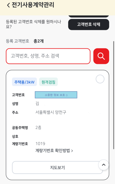 1) 한전 ON 어플 > 홈화면 > 전기사용 계약관리 > 고객번호 확인!